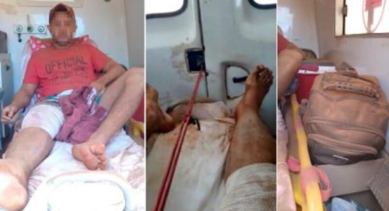 Com a perna enfaixada, ele relata que a porta do automóvel é fechada de forma improvisada com uma corda, segurada pelo próprio paciente durante todo o trajeto.