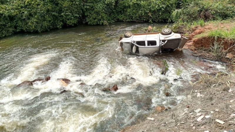 Com o impacto, a caminhonete ficou bastante danificada e caiu no meio da água, ficando com a lateral esquerda submersa.