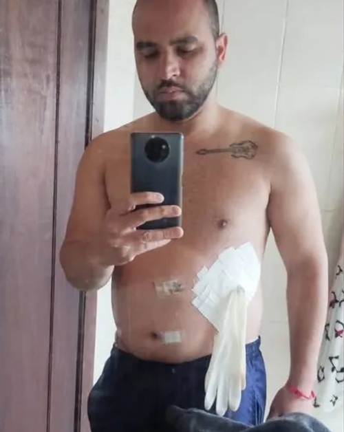 “O médico falou que era medicina de guerra e colocou uma luva improvisando o procedimento. Saí do hospital com aquela luva pendurada na barriga, vazando muito. Em casa eu não tinha controle. Fiquei encharcado de secreção… Minhas roupas e cobertores ficaram todos molhados”.