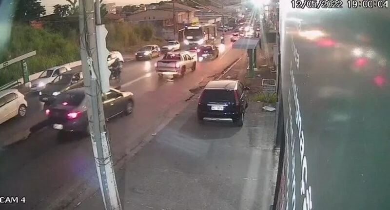 a vítima conduzia a moto ao lado do ônibus, quando perde o controle do veículo e cai próximo a roda do ônibus, e é esmagado pelo coletivo.