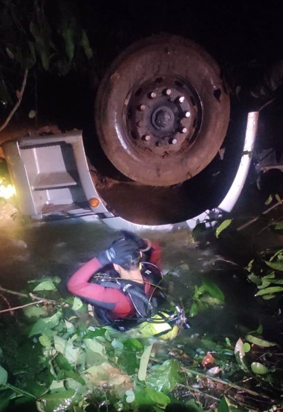 A equipe de mergulhadores se deslocaram até o lugar do acontecido, e ao chegar verificaram que o motorista ainda estava preso dentro da cabine.