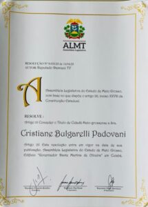 Cristiane Bulgarelli Padovani (Kika), no momento em que recebeu o Título de Cidadã Matogrossense das mãos de Damiani, falou para ele de sua gratidão pela honraria e contou que há 23 anos já se intitula uma matogrossense por adoção, mas agora, com esse Título, sente-se uma filha legítima dessa terra.