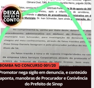 Na denúncia cita que o atual Procurador do Municipio de Sinop Dr Ivan Schneider, seria o mais interessado no cancelamento do concurso, uma vez que este tem demonstrado ser o manda chuva da gestão Roberto Doner, e o que indica é que todos os atos realmente acontece com total anuência do prefeito e outras pessoas diretamente ligado a administração.