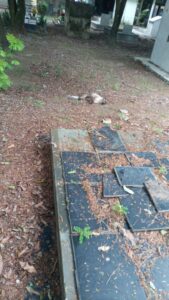 No fim de semana passado vários felinos foram encontrados mortos (que usam o cemitério por falta de moradia) por ataque de um pitbull que adentra o local todas as noites.